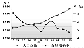3、单选题 上海市1993年以来出生率在6‰以下,死亡率在8‰以下 。 图是1993~2003年来上海市人口总数与自然增长率变化示意图,据此回答下列各题。