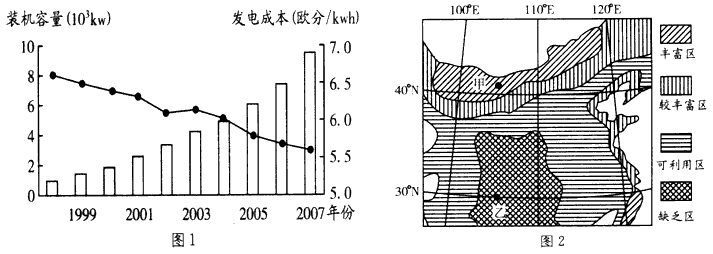 2、综合题 图1是全球风电装机容量和发电成本变化图,图2是某区域风能资源分布图。读图回答问题。