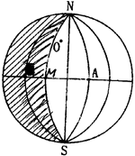 2、综合题 中心点表示北极,阴影去为3月21日,非阴影为3月22日。读图回答。