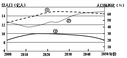 小题1:图中曲线表示我国总人口、劳动年龄人口及人口抚养比的依次是
