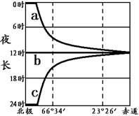 3、单选题 读a、b、c三个月份北半球各纬度夜长的分布规律图,回答问题。