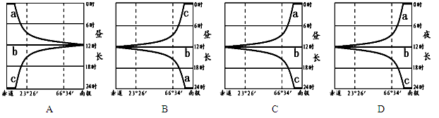【小题2】下列南半球各纬度昼夜长短分布规律图与上图表示月份对应正确的是