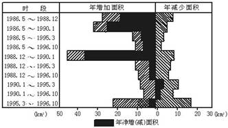 下图反映的是黄河河口地区不同时段在黄河泥沙淤积作用和海洋潮流作用共同影响下,黄河三角洲陆地面积增减的变化情况。据此回答第1题。