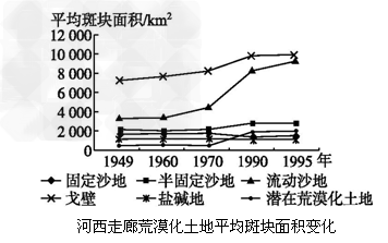4、填表题 读“‘三北’地区沙漠沙地与荒漠化土地分布图”和“河西走廊荒漠化土地平均斑块面积变化图”,完成下列问题。