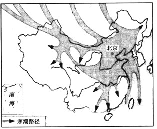 材料一:2011年3月13日20时至15日20时,受强冷空气影响,我国中东部出现了一次大范围的大风降温天气过程,其中,西北地区东南部、东北地区东部、华北大部、黄淮、江淮、江汉、江南、华南大部等地降温6~12℃,局部地区达14℃;新疆南疆盆地、西北地区东部、内蒙古中东部、华北、东北南部、黄淮、江淮、江南北部等地有5~7级风。
