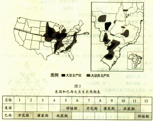 3、单选题 读图2“美国和巴西大豆产区图”及相关资料,回答7~9题。