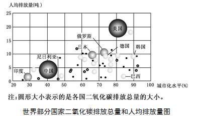 小题1:中国二氧化碳排放总量最大是因人口多,排放源多;印度的城市人口比重为30%,其值较低;俄罗斯因扩大工业化,消耗的能源增多,排放的二氧化碳多,日本民用和办公场所消耗的能源占比重较大;而二氧化碳的排放主要是因消耗大量的化石能源,美国经济发达,所消耗的化石能源多,所以排放的二氧化碳多。故选C。