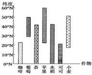 1.纬度不同,地表热量不同,热量由低纬向高纬递减;作物最适宜生长的纬度范围越广,则热量适应范围就越广;由图可知,咖啡、葡萄、可可均只跨纬度20°左右,比其它四种作物跨的纬度数少,说明这三种作物热量适应范围较狭小,C选项正确。