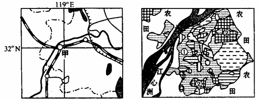 5、单选题 读甲城地理位置(左图)和城市用地结构图(右图),回答下列各题。