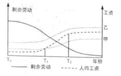 小题1:T0及T0-T1阶段剩余劳动力多,工资水平低,为劳动力型工业,技术水平低,而排除A、B项,T1-T2阶段工资水平急剧上升,是实现产业结构调整,完成产业升级的结果,故B选项正确。
