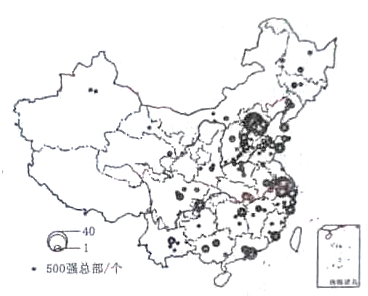 本题解析:本题考查工业区位及读图分析能力。第(1)题,联系中国地理的相关知识并分析题目所给图形可知,图例所示地理事物主要分布在中国东部沿海经济发达的省区和 城市,其中京津冀地区和长三角地区最为集中,而西北部地区数量明显较少,即该事物总体上空间分布很不均匀。第(2)题,根据该事物的分布特点,可举我国东 部地区的一些典型地区和城市为例;分析其吸引企业总部投资的优势条件,可以联系所学的工业区域选择的有关知识,如从位置、科技力量和水平、基础设施、交通 运输、信息通畅度等方面进行分析。