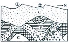2、单选题 下图为某地地质剖面图,其中C为沉积物,B、F、G为沉积岩,A、D为不同时期的岩浆岩,E为变质岩。据此回答下列各题。
