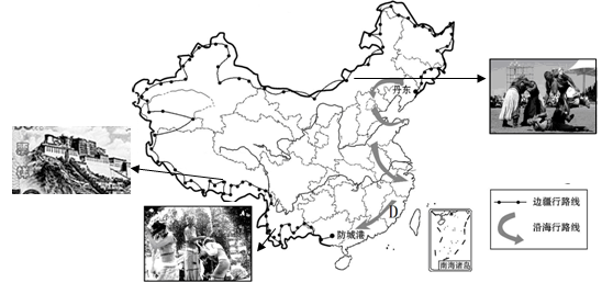 “远方的家”专题片《边疆行》,从广西按顺时针方向途经云南、西藏、新疆、甘肃、内蒙古、黑龙江、吉林至辽宁沿途拍摄,宣传我国边疆的风土人情(如图),有利于推动边疆旅游业的发展。