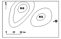 【小题1】据题干信息“该气压系统以每天120千米的速度自西向东移动”,可知24小时后甲地位于低压中心的东南侧,风从高压吹向低压,垂直等压线,北半球向右偏,则可知甲地主要吹东南风。