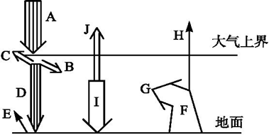 (1)由图可知,根据所学知识和图中字母代表的箭头方向来判断:图中字母A代表太阳辐射,F代表地面辐射,I代表大气逆辐射。