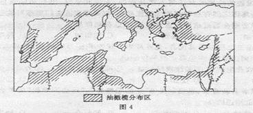 5、单选题 油橄榄是世界著名的亚热带果树和重要经济林木,富含优质食用植物油——橄揽油。油橄榄最适宜生长区主要分布在图4所示地区,现在很多国家均引种栽培。读图回答问题。