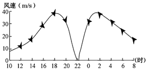 小题1:由图可知,该天气系统过境时,从10点到18点左右,风速由10m/s以下迅速增大到接近40 m/s,远超过10级;到22点风速降为0 m/s,2小时后风速又急剧增大到40 m/s左右,然后又降低;风向也在不断变化;这明显是台风(飓风)过境时的风速、风向变化,22点时风速为0,是台风眼过境;台风(飓风)过境时常带来大风、特大暴雨等灾害,故C选项正确。台风(飓风)生成在北纬10°多的海洋上,不可能生成在赤道地区的海洋上,因为沿赤道运动的气流不受地转偏向力的影响,水平运动的气流不偏转就不会形成气旋(台风、飓风),故A选项错误;B选项所述是冷锋过境时的天气;C选项所述是准静止锋过境时的天气