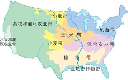 第(1)题,本题考查美国中部平原的商品谷物农业的分布。美国发展该农业的优势区位条件自然条件从地形,气候,土壤,水源等方面分析;社会经济条件从交通,市场,科技,机械化水平等方面分析。在这里注意,“这里发展商品谷物农业优越的自然条件”要从自然条件方面分析。美国农业带分布如图所示,