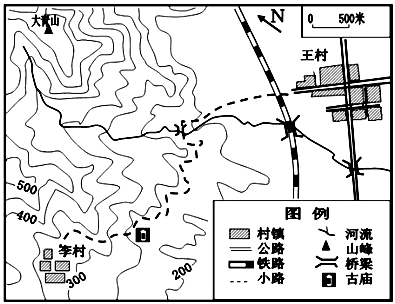 (3)等高线越稀疏,说明坡度越平缓。据图可知:图中小桥至古庙一段的路线与等高线大致平行,坡度较缓,所以行走感觉轻松。