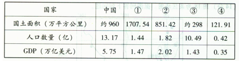 1.表中序号代表的国家是2.金砖国家中,人均GDP最低的是3.金砖国家经济迅速发展的共同优势条件是