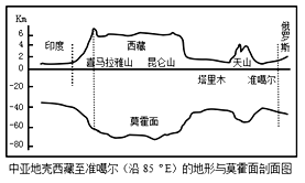 5、单选题 读“中亚地壳西藏至准噶尔(沿85 ºE)的地形与莫霍面剖面图”,下列说法正确的是( )