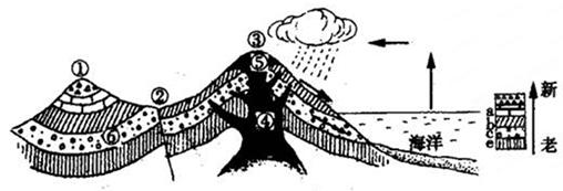 (2)④、⑤均位于岩浆通道附近,均为岩浆岩;⑥岩层具有明显层理构造,为沉积岩,除这一特征之外,含有化石也是沉积岩的另一特征。