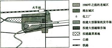 (3)随着城市社会经济的发展,拟在图示地区建大型服装批发市场、大型超级市场、蔬菜基地。请分析其选址的条件。(6分)