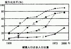 2、单选题 图为甲、乙、丙、丁四国城市化水平变化示意图,读图完成问题。