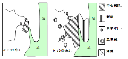 (1)图b与图a相比,城市用地规模明显?,城市人口数量呈?趋势。反映了该地区的?过程。(3分)