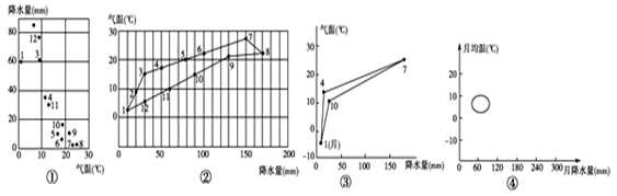 小题1:①地7月高温少雨,1月低温多雨,是地中海气候;②地7月高温多雨,1月低温少雨,雨热同期,最冷月气温大于0度,是亚热带季风气候;③地7月高温多雨,1月低温少雨,最冷月气温小于0度,是温带季风气候;④地全年温和多雨,是温带海洋性气候。选C正确。