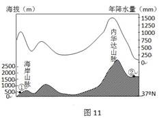 4、单选题 图11是沿37?N世界某地地形剖面及年降水量分布图,据图判断问题。