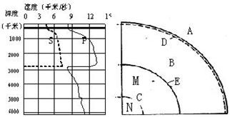 1、综合题 读“地震波速度与地球内部构造图”,回答下列问题:(10分)