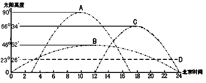 2、综合题 下列A、B、C、D四条曲线表示不同纬度在6月22日的太阳高度日变化,读图回答相关问题。(26分)