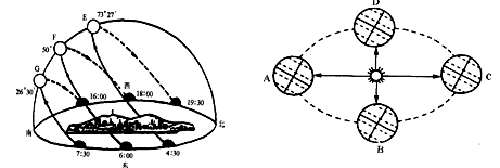 (3)根据A表示太阳直射北回归线的夏至日,C表示太阳直射南回归线的冬至日,则B表示秋分日;春秋分日,太阳从正东方升起,正西方落下,故为F点。