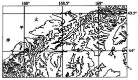 小题2:把地貌延伸长度转移到经线上,跨经度约0.4°,故长度0.4*111KM。