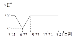 4、单选题 读北半球A、B地正午太阳高度角的差(ΔH=HB-HA)随时间变化图,完成下列问题