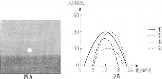 3、单选题 下图为一位游客于某日北京时间22时,在某地(87°E,49°N)附近拍摄的太阳照片。据此完成下列题。
