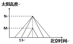 读图,该地位于北半球,所以M是冬至日时的正午太阳高度最小值。N是夏至日时最大值,但夏至日最大值与二分日时的正午太阳高度相同,说明该地位于赤道和北回归线的中间,?约11°43′N。所以MN两数之差小于47°,A错。读图,根据图中二分日时,北京时间13点日出,计算出该地位于东1区,所以当该地夏至日正午12点时,即15°E为12点时,58058/W约为7点,不可能是日落,B错。黄河站位于北半球,11056/E地方时约为11点48分,所以太阳位于黄河站的东南方向,日影朝向西北,C对。夏至日后一个半月,可以直射N地,太阳高度角达到最大,可能等于N,所以D错。