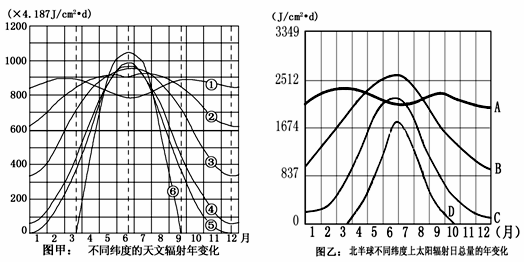 1、单选题 天文辐射指的是大气上界的太阳辐射,图甲、乙中的曲线表示不同纬度的天文辐射(大气上界的太阳辐射)的年变化和北半球不同纬度地面太阳辐射的年变化,读图完成下列各题。