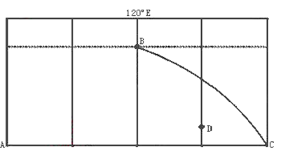 1、综合题 (12分)图中AC为赤道,BC为晨昏线的一部分,B点的地方时比A点早,此时D点地方时为15点,读后回答: