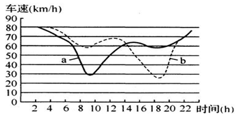 小题1:本题考查地理图表的判读能力。根据图示a曲线在9:00前后车速慢,说明车流量大;b曲线在18点前后,车速慢,车流量大。则a曲线反映由郊外住宅区向市中心工作区的车速变化。所以本题选择B选项。