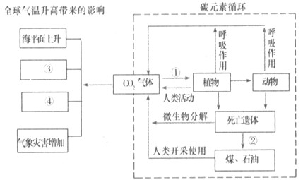 (1)碳元素是生态环境中的重要物质,它不但参与地球上的物质循环,而且参与能量流动。下图中各数字所表示的作用或结果分别是: ①____________②____________③____________④____________
