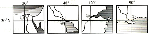 3、单选题 读30°N线附近四个地区简图,回答下列各题。