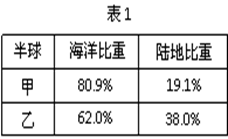 4、单选题 表1是东半球和南半球的陆地与海洋所占比重表,由此可知