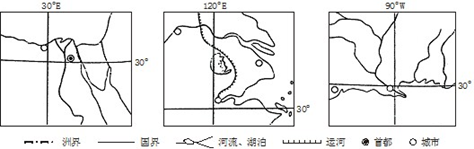 5、单选题 读“北纬30°附近三个三角洲位置示意图”,回答21-22题。