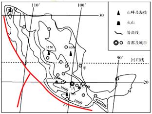 (1)描述图示区域的地形特征,并在图中适当位置画出与该国地形形成有关的三大板块分界线(10分)。