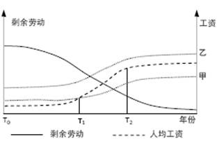 5、单选题 下图表示某区域在一定时期内剩余劳动力数量、人均工资的变化,以及甲、乙两类企业在该区域维持最低经济效益所能支付人均工资的变化。读图判断下列叙述正确是?