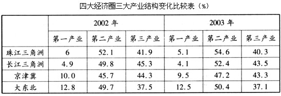 3、单选题  下表反映了2002~2003年间,我国珠江三角洲、长江三角洲、京津冀、大东北等四大经济圈三大产业结构的变化情况,阅读下列材料,回答1~3题。