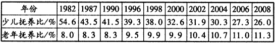 2、单选题 人口抚养比是指总人口中非劳动年龄人口数与劳动年龄人口数之比,通常以百分比表示。一般以15岁至64岁为劳动年龄人口,14岁及以下和65岁及以上为非劳动年龄人口。下页表为中国1982~2008年的人口抚养比变化表。据此回答1—2题。