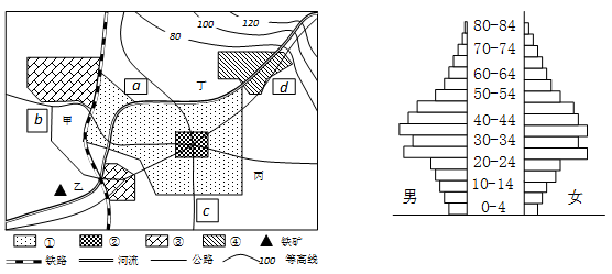 1、综合题 下图是“某城市规划简图”(左图)及近年该城市统计的“人口年龄结构金字塔图”(右图),该市常年盛行东北风,读图回答下列问题。